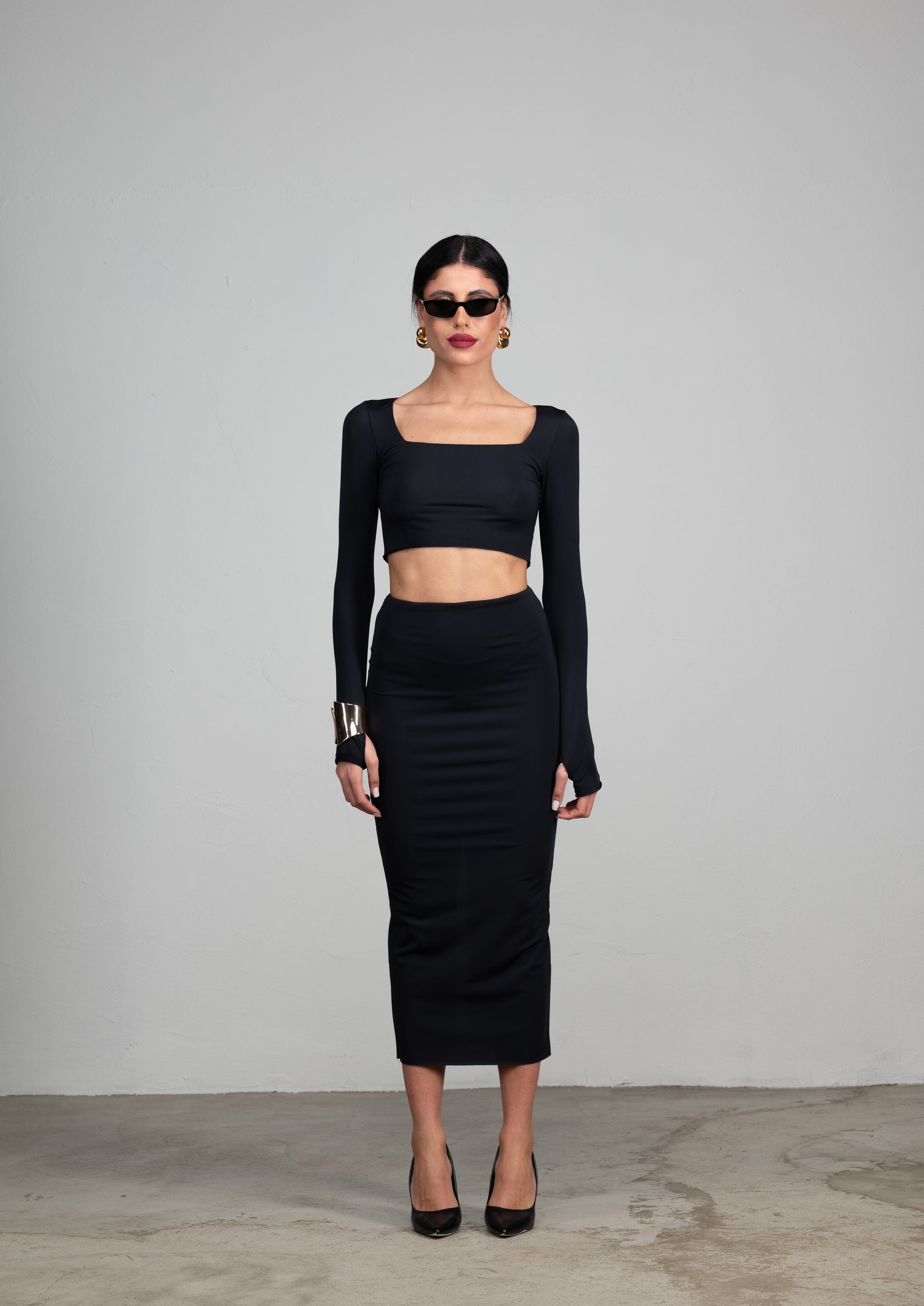 Composto da un top a manica lunga aderente con foro per il pollice e scollo quadrato, esalta la figura grazie alla sua vestibilità scolpita. La gonna midi si adatta perfettamente alle forme grazie al tessuto contenitivo. All’interno, una culotte integrata garantisce sostegno e un effetto modellante, mantenendo comfort e libertà di movimento.Sul retro arricchita con spacco e zip invisibile.