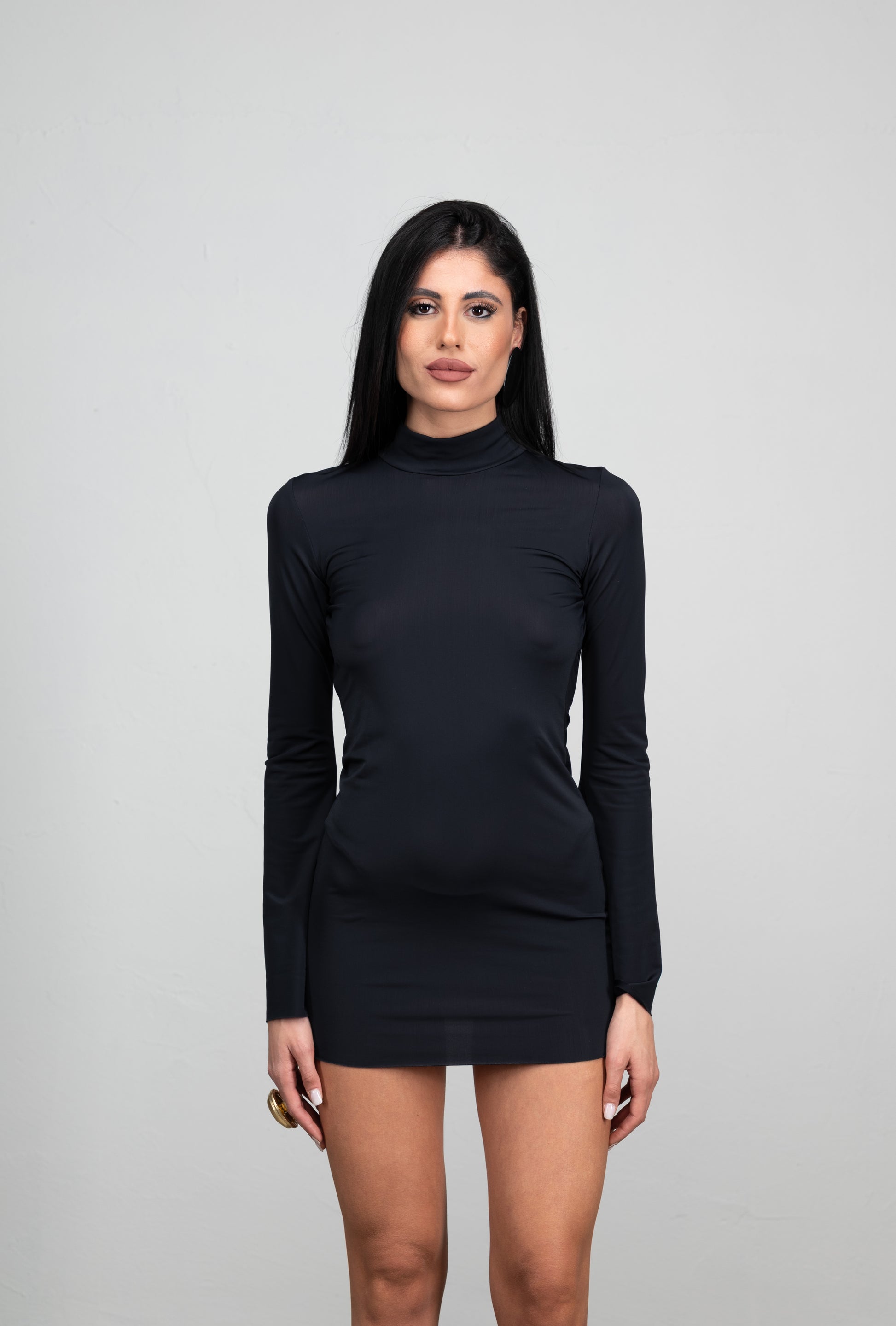 Un abito da sera dallo stile semplice ma di grande impatto. Il Midnight Mini Dress dal fit aderente è caratterizzato dalle maniche ampie al fondo e le cuciture a taglio vivo. Collo alto e scollo profondo sul retro.