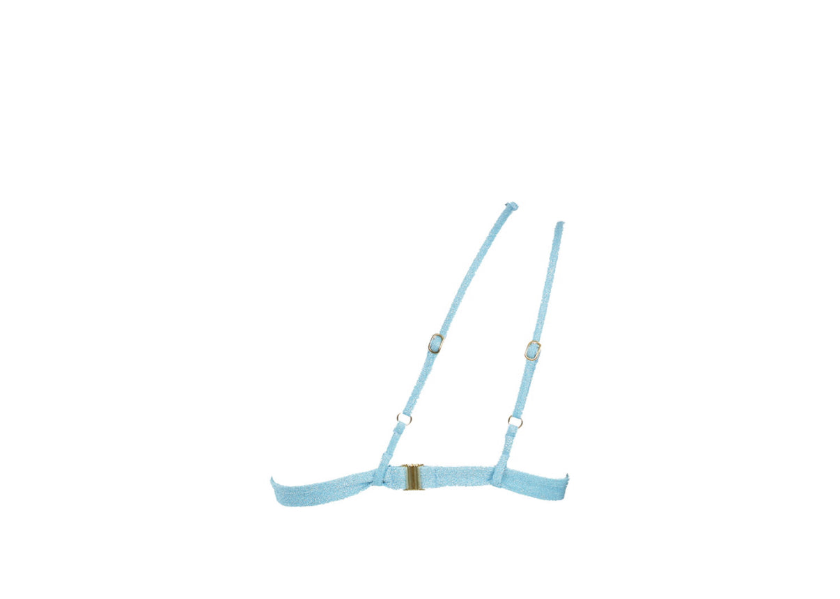 Top asimmetrico con coppetta estraibile, chiusura con gancio sul retro. Spalline regolabili.